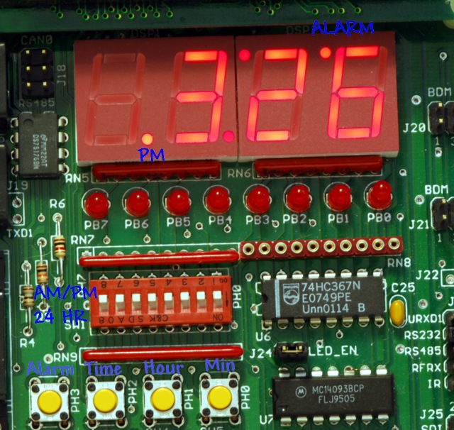 This web page is a slightly shortened and modified version of the Alarm Clock Example chapter of the CD textbook Designing with Microcontrollers -- The 68HCS12. The alarm clock provides an interesting project for the Dragon12-plus or DRAGON12 development boards and provides a very practical use for the board after the course is completed! The C source code is intended for use with the GNU C compiler, such as provided with the freeware EmbeddedGNU IDE.