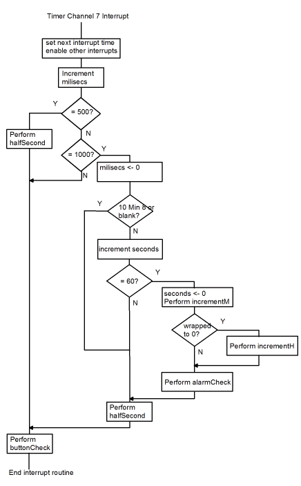 The timer channel 7 interrupt service routine does many things. The interrupt occurs every millisecond yet it manipulates the display to flash the colon (and perhaps 88:88) twice a second, update the time once a minute, check the alarm time once a minute, and poll the push buttons which repeat four times a second. Because of the complexity, let's start with a flow chart.