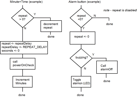 If the buttons haven't changed in 10 milliseconds, the various button combinations are tested. If a match occurs, the appropriate code is executed. The flow charts below show the operation of the Minute+Time buttons, for which the other combinations of buttons have similar implementation, and the Alarm button alone. The time button alone is also checked, and if it alone is pressed then powerOnCheck is called.