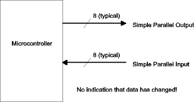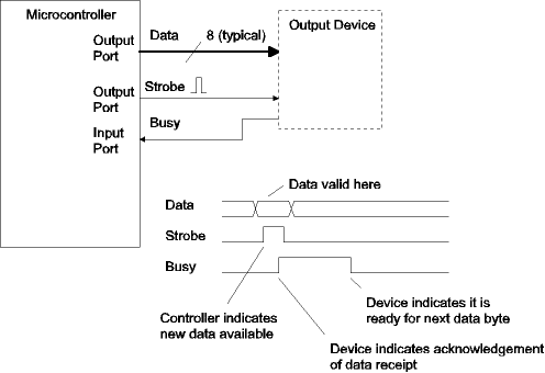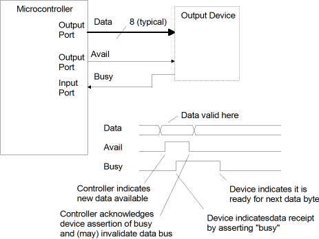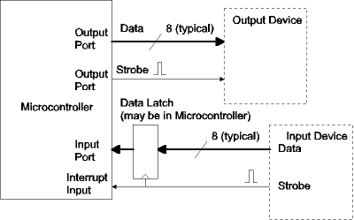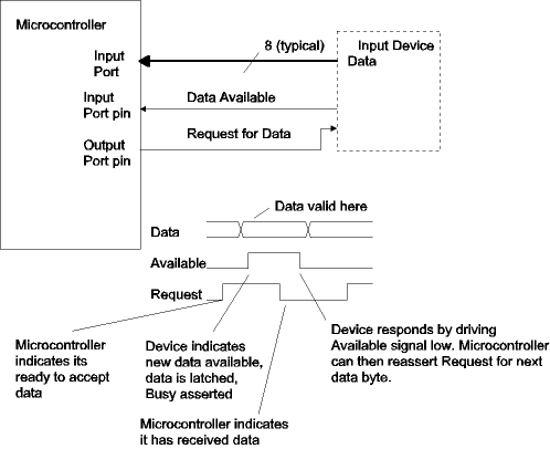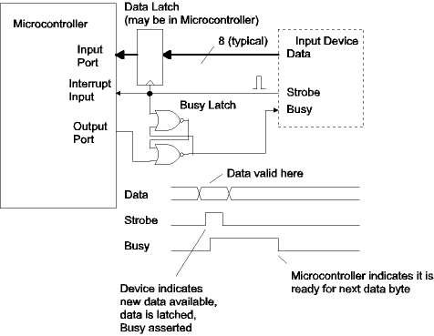 The figure below shows handshaking for an input device. The signals are the same but the roles of the microcontroller and external device are reversed. In this case a latch was added so that busy would be asserted immediately when data is received. The microcontroller pulses an output port pin to reset the busy latch when it is ready for the next data byte.