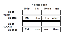 The two TIME arrays are for the current time while the two ALARM arrays are for the alarm time. The decimal point value is kept separate from the time value for ease of time calculations. The C declarations will actually declare the two TIME arrays as a single 8-byte array and the two ALARM arrays as a single 8-byte array so that they each can be passed as a single argument to a function. Proper technique would be to define each as a structure containing two arrays, but this approach is simpler for a reader who might be "rusty" with the C language. Two macros are defined for the decimal point arrays, disptdp and dispadp, to be at 4 bytes into dispt and dispa, respectively. The display arrays are initialized for the time to be blank (it will flash between blank and 88:88) and the alarm time of 1:00. In addition, the two decimal points making the colon of the alarm time are turned on. They will always be on - they don't flash.