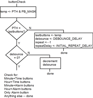 If the buttons haven't changed in 10 milliseconds, the various button combinations are tested. If a match occurs, the appropriate code is executed. The flow charts below show the operation of the Minute+Time buttons, for which the other combinations of buttons have similar implementation, and the Alarm button alone. The time button alone is also checked, and if it alone is pressed then powerOnCheck is called.